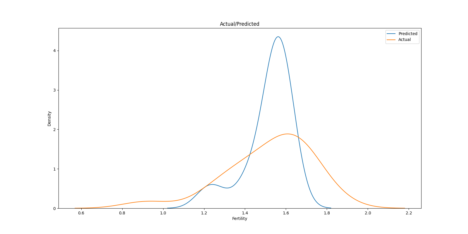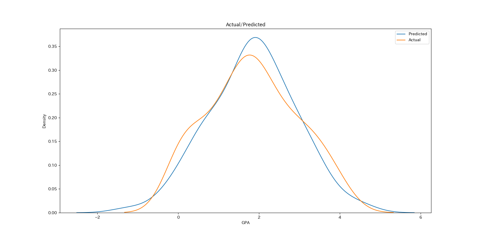 実測値と予測値のカーネル密度プロット (Karnel Densiti Estimation Plot)を重ねたグラフもベイズモデルなどでよく利用される手法です.