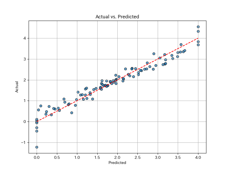 plt.show()実測値と予測値が一致していれば,この散布図はグラフの45度線(赤い点線)上に一直線になります. 殆どの点が45度線付近に集まっているからかなり正確に予測ができていることが分かります.
