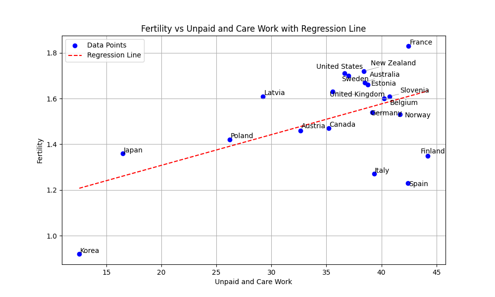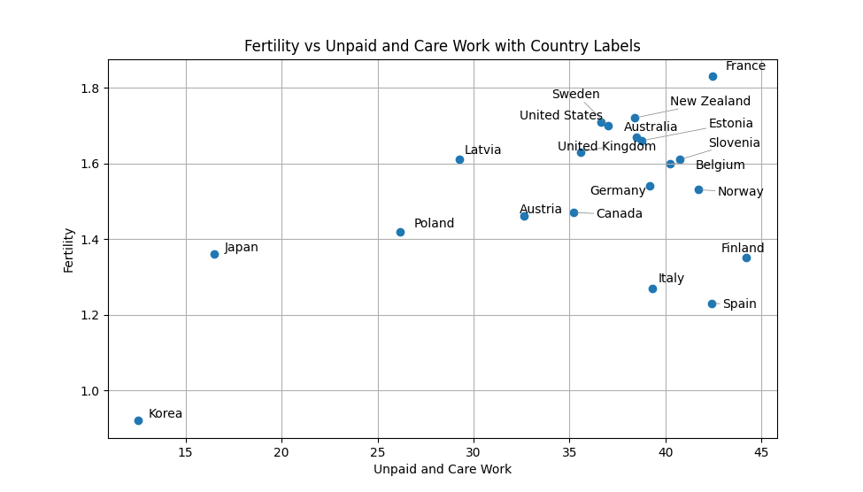 元POSTでは, 日本経済新聞がOECD Family Databaseのデータから作成したグラフを用いて男性の育児・家事時間の少なさが日本の少子化の原因であると主張しています.