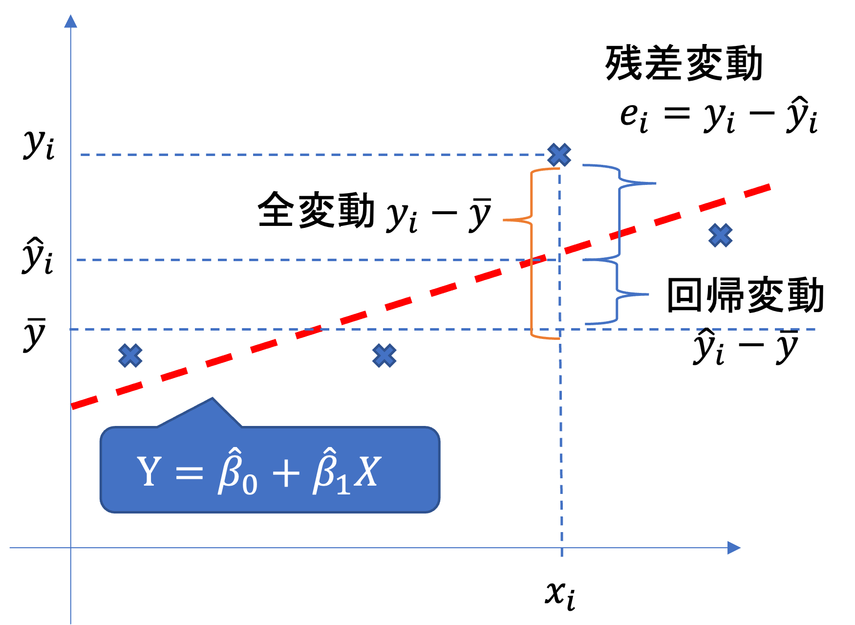 標本回帰方程式 Y=\hat{\beta_0}+\hat{\beta_1}X によって求められる各 i の値(回帰値)