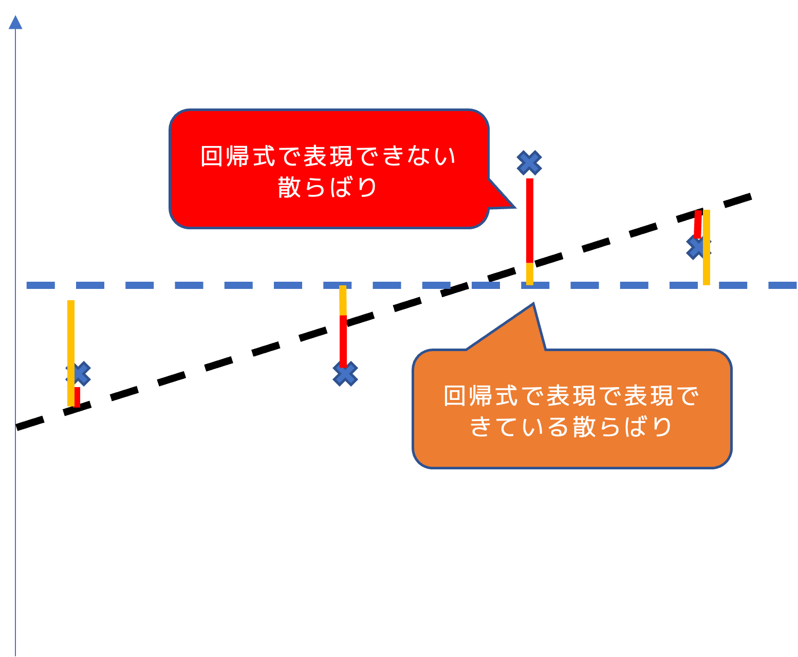 が少ないほど, X_iによるY_iの説明力が上がります(モデルによってよく関係が説明できている.)