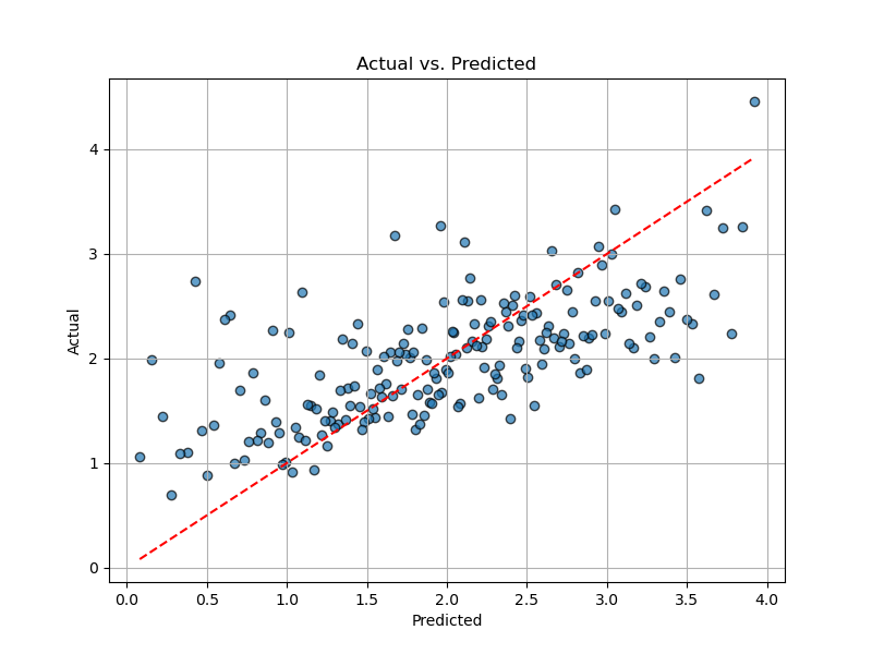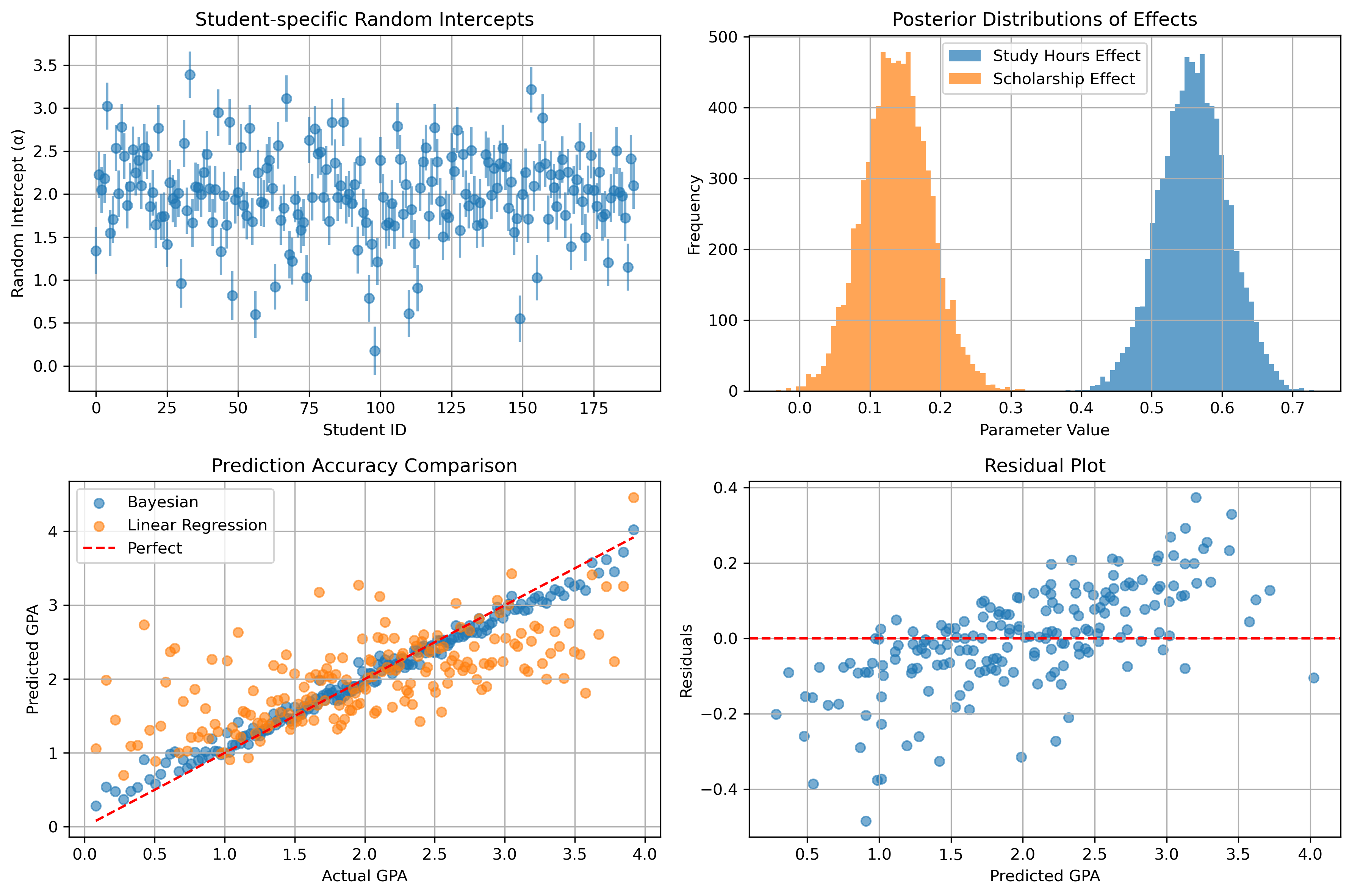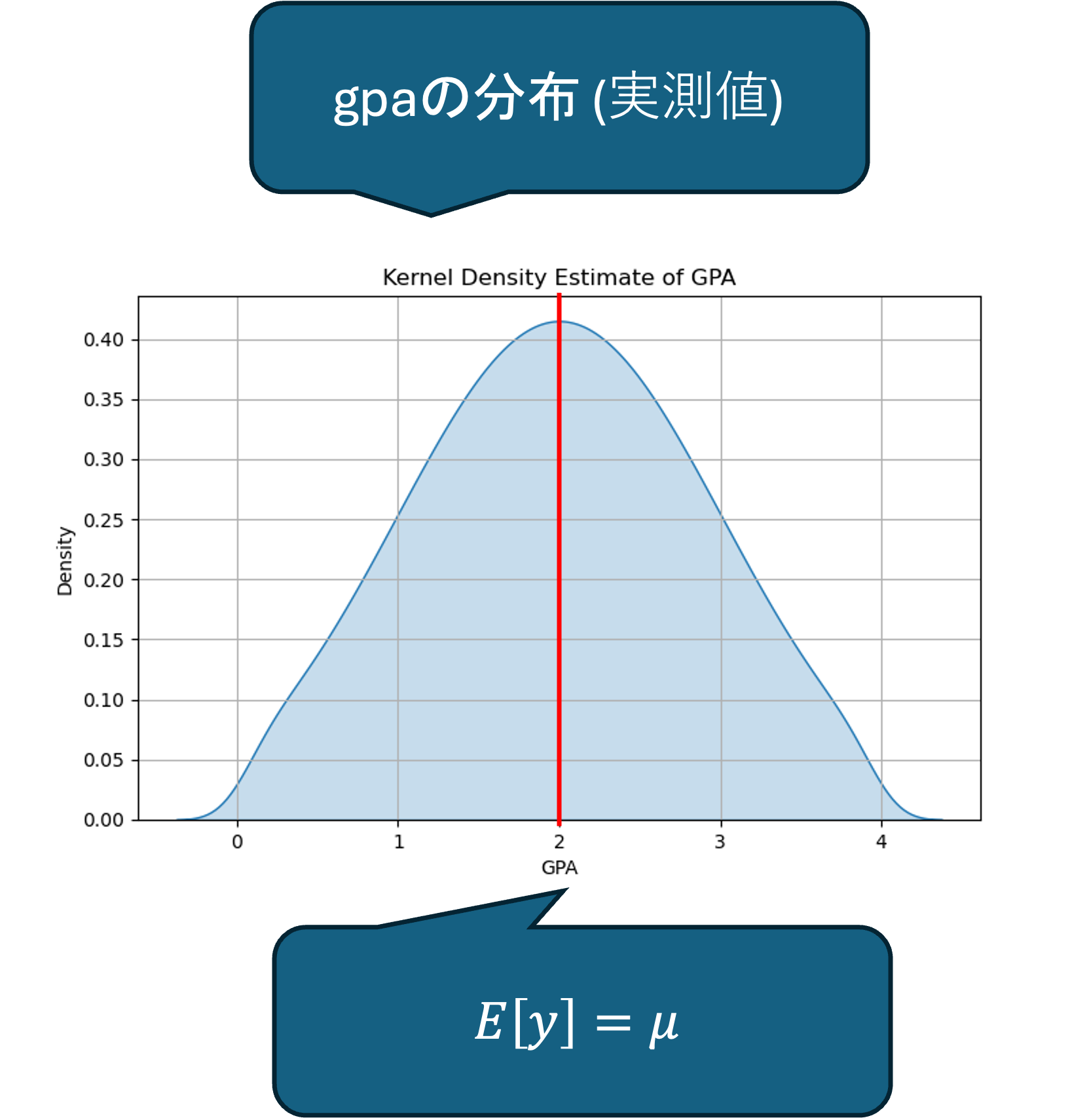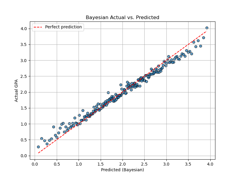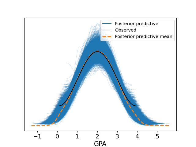 print(f"[階層ベイズモデルのRMSE] {bayes_rmse:.4f}\n")idata.posterior_predictive["GPA"]: 事後予測分布から生成されたGPAのサンプルです. このデータは,複数のチェーン(chain)と複数のドロー(draw)から構成される多次元配列です..mean(dim=("chain", "draw")): すべてのチェーンとドローにわたって平均を計算します. これにより,各観測値について,事後予測分布の平均値(期待値)を取得できます. つまり,各学生のGPAについて,モデルが予測する平均的な値を計算しています..values:xarrayのデータ配列をNumPy配列に変換します. これにより,後続の計算や可視化で使用しやすくなります.mean_squared_error(df["GPA"], posterior_mean): 実測値(df["GPA"])と予測値(posterior_mean)の間の平均二乗誤差(RMSE)を計算します. この値が小さいほど,モデルの予測精度が高いことを示します.