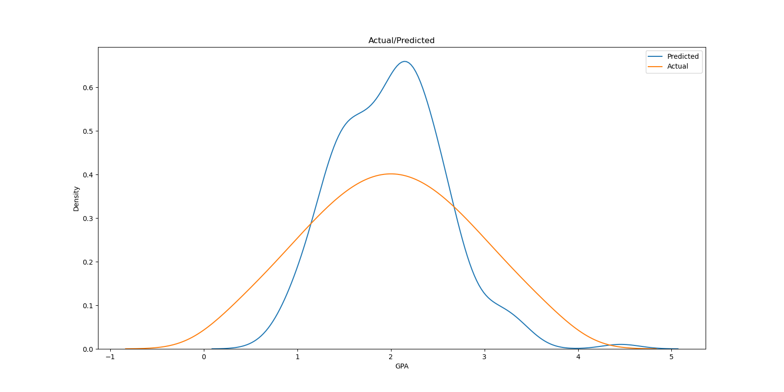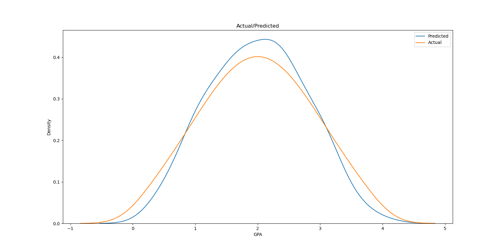 つぎに,線形回帰と同様に予測値と実測値の関係とkdeプロットを見てみましょう. まずは予測値を取り出します.