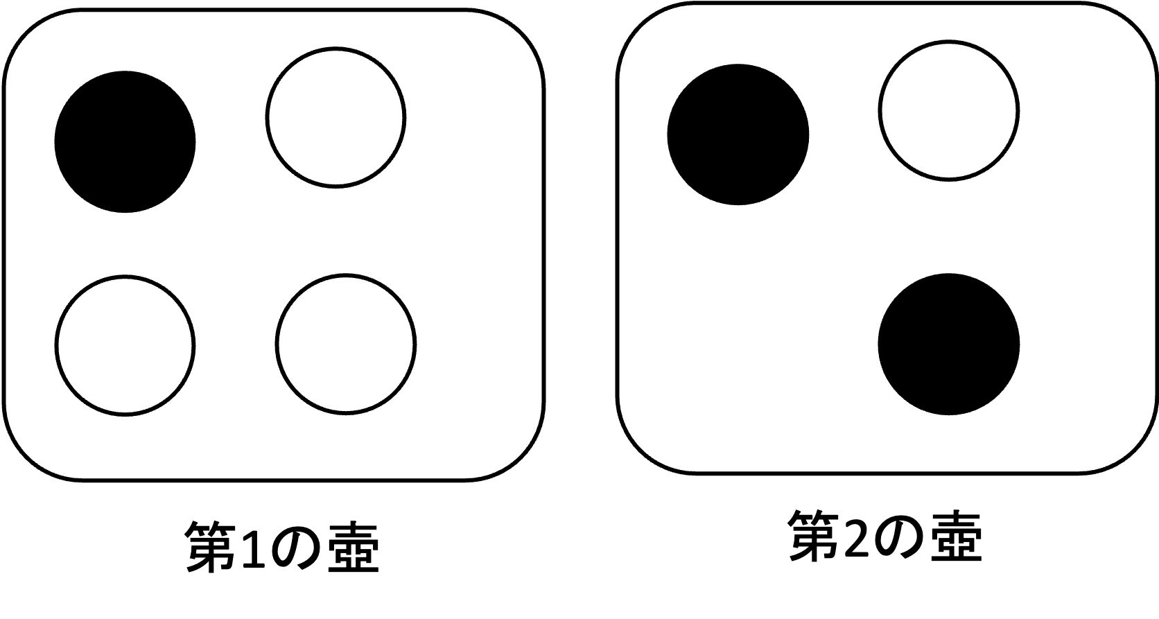 まず,どちらの壺から取り出すかは五分五分であると仮定する. ここでこの仮定が完全に分析者の主観に基づくのであれば主観確率であり,何らかの実験等によって確率0.5であると確かめられている場合には客観確率とみなされる.