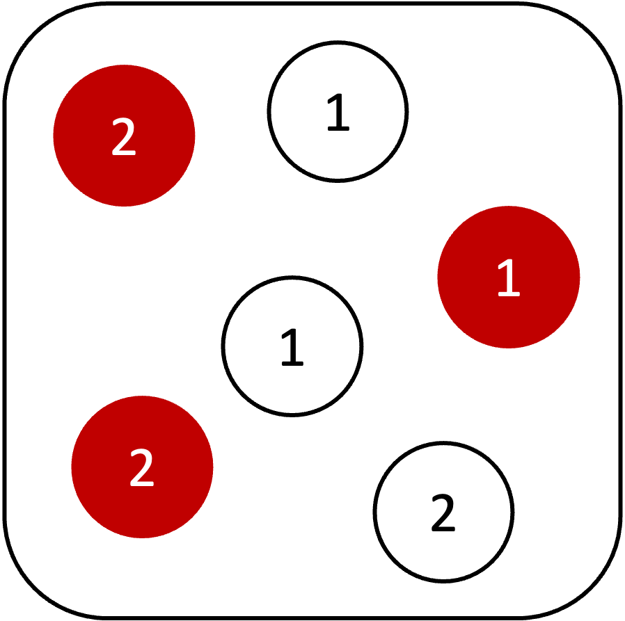 壺に白,赤それぞれ3つの玉が入っている.白玉には1,1,2と数字,赤玉には1,2,2と数字が書かれている. 次に出る玉が白であることがわかっている場合に1の玉がでる確率は?