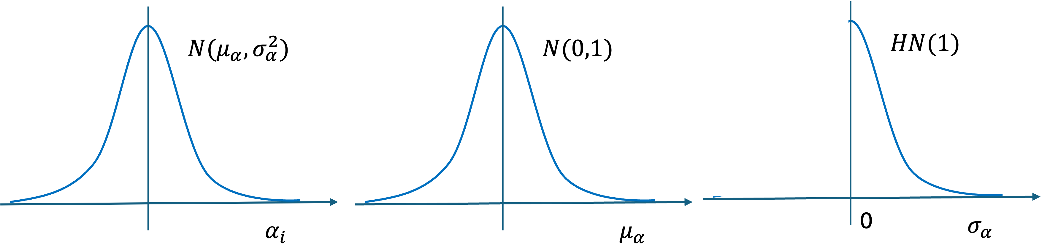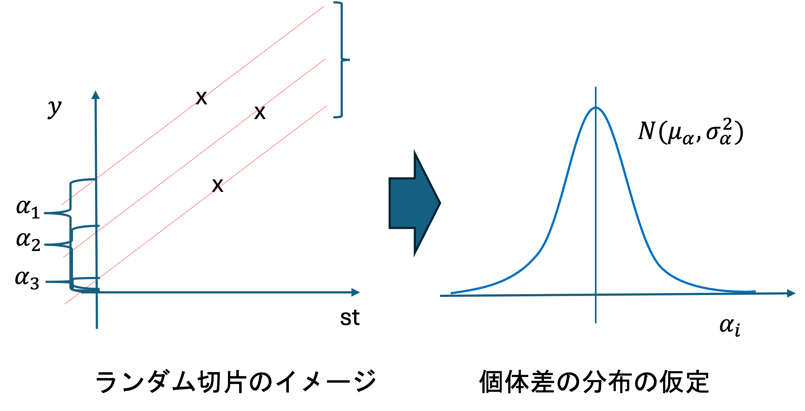 ランダム効果モデルでは,各個体のパラメータが,より大きな分布(例:\alpha_i \sim N(\mu_{\alpha}, \sigma_{\alpha}^2))からサンプリングされると仮定します. この仮定により,個体間で情報を共有し,より安定した推定が可能になります.