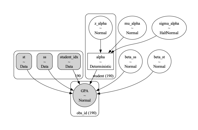 sigma_alpha = 0.586: 学生間の基礎学力のばらつきの標準偏差です. この値が大きいほど,学生間の学力差が大きいことを示します. HDI区間[0.514, 0.659]は比較的狭く,推定の不確実性は小さいです.alpha[i]: 各学生の基礎学力です. 例えば,alpha[4] = 3.02は,学生4の基礎学力が高いことを示しています. 一方,alpha[187] = 1.153は,学生187の基礎学力が低いことを示しています. 学生間で基礎学力に大きなばらつきがあることが分かります.beta_st = 0.559: 勉強時間の効果です. この値は正で,勉強時間が1単位増加すると,GPAが平均的に0.559増加することを示しています. HDI区間[0.473, 0.651]は0を含まないため,統計的に有意な正の効果があります. この区間は比較的狭く,推定の不確実性は小さいです.beta_ss = 0.139: 奨学金の効果です. この値も正で,奨学金を受給している学生のGPAが平均的に0.139高いことを示しています. HDI区間[0.044, 0.225]は0を含まないため,統計的に有意な正の効果があります. この区間も比較的狭く,推定の不確実性は小さいです.