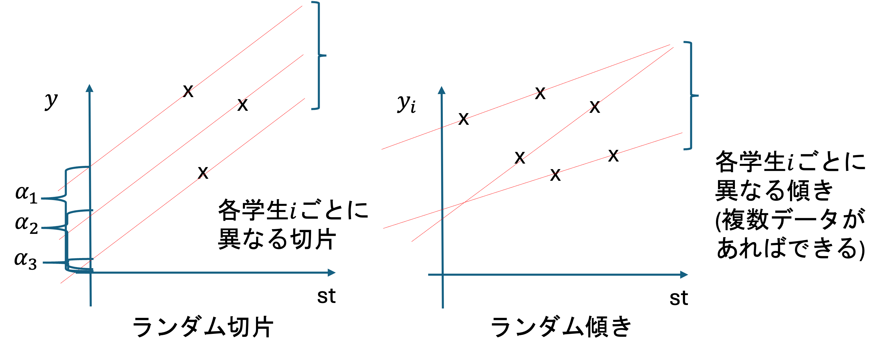 固定効果モデルでは,各個体(例:学生)に対して独立したパラメータ(例:切片\alpha_i)を推定します. 各パラメータには特別な制約がなく,データから直接推定されます.