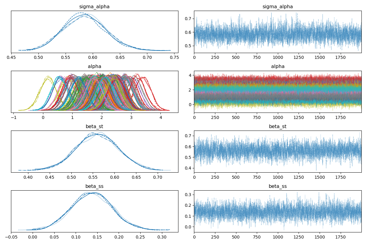 ess_bulk)は,すべてのパラメータで400を大きく超えており,サンプリングは適切に行われています. 特に,alpha[i]の多くは6000-11000の範囲で,非常に良好なサンプリングが行われています.beta_stとbeta_ssは1889と1957となっており,やや低めですが,推奨値(400)を大きく上回っており,問題ありません.