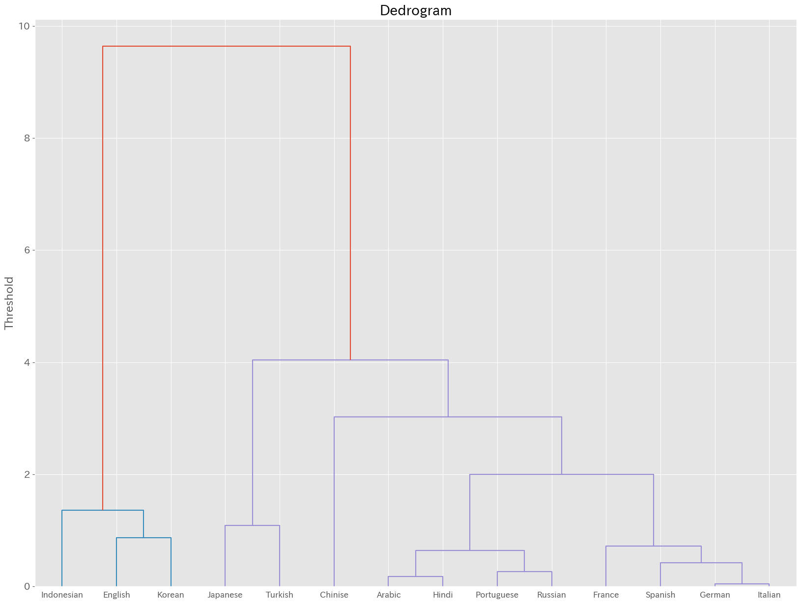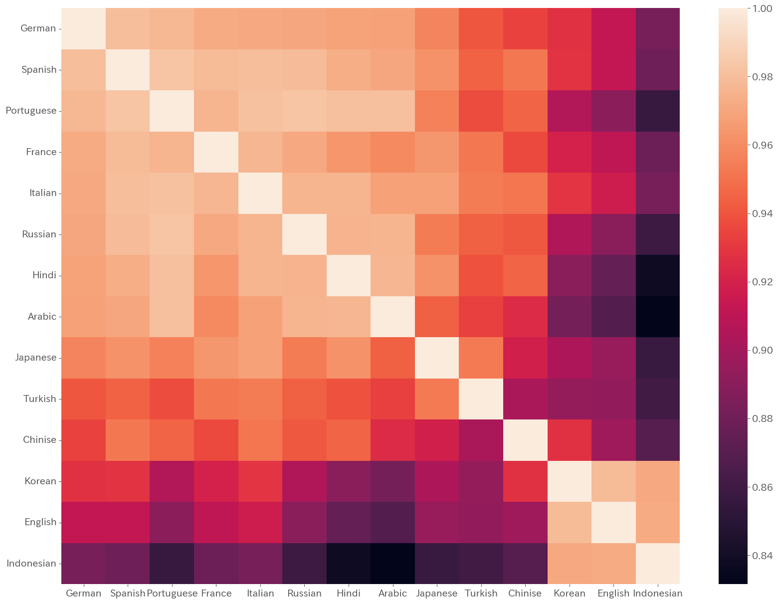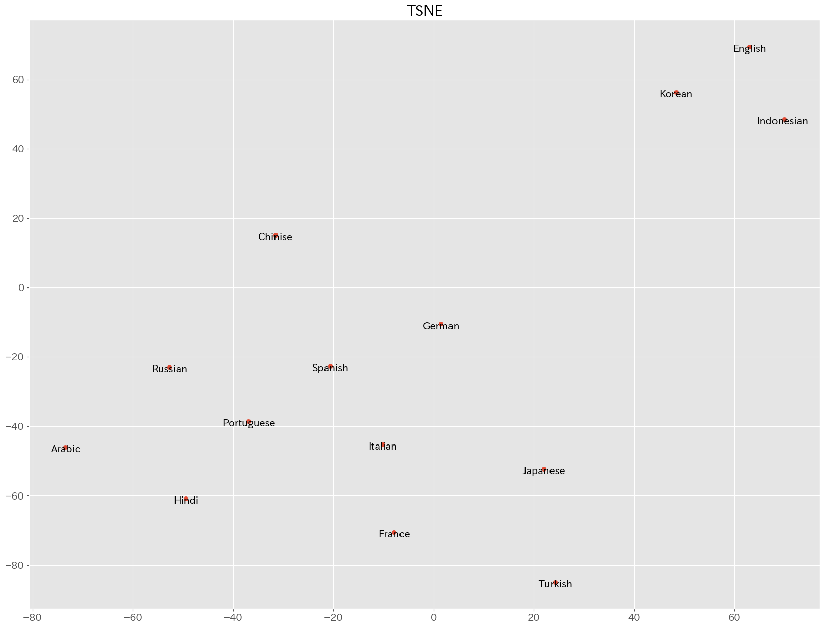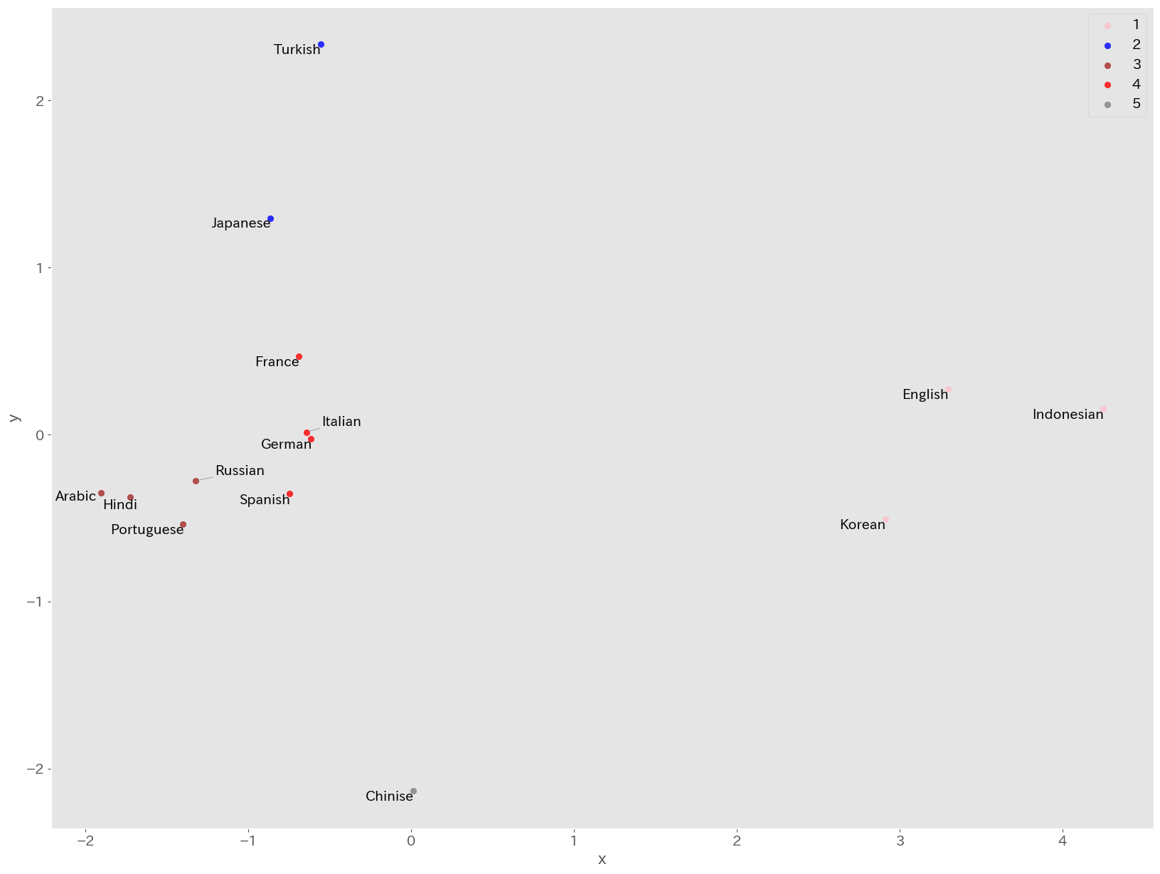 英語,韓国語,インドネシア語のクラスタ1,日本語,トルコ語のクラスタ2,アラビア語,ヒンディー語,ポルトガル語,ロシア語のクラスタ3,フランス語,ドイツ語,スペイン語,イタリア語のクラスタ4,中国語単体のクラスタ5になりました.