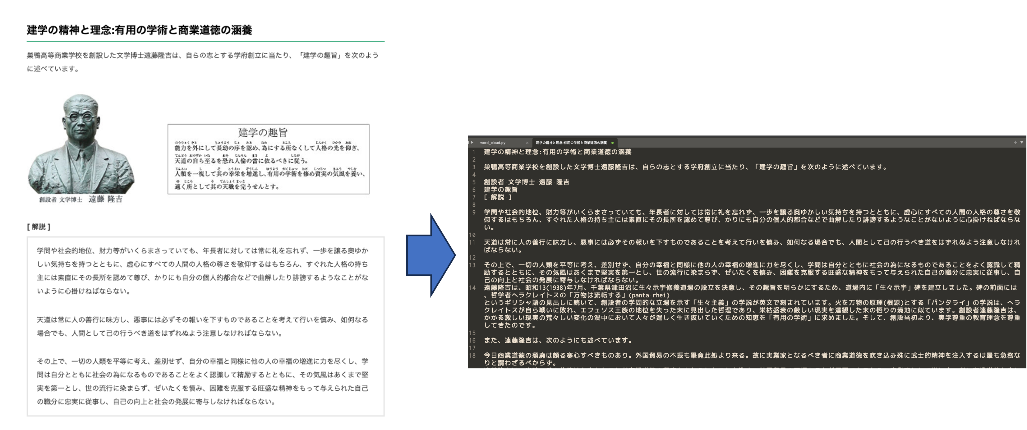 巣鴨高等商業学校を創設した文学博士遠藤隆吉は、自らの志とする学府創立に当たり、「建学の趣旨」を次のように述べています。