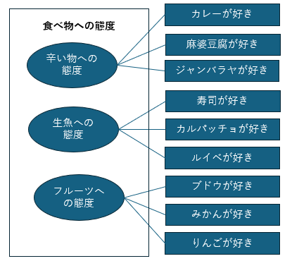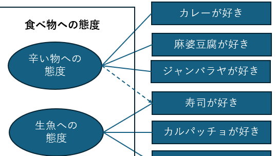 因子分析では直接観測できる質問項目(下位尺度)への反応から,直接観測できない「食べ物への態度」を構成する因子を測定し,それによって全体の概念を説明します. 各質問項目が因子につながる共通の部分を持っているかどうかは,質問項目間の相関係数から求められます. 質問項目によっては,2つ以上の因子にかかわることがあります.例えば,わさびが寿司につきものであるなら,多少は辛い物への態度が影響している可能性が考えられます.このようなケースでは,下位尺度のグループ化において,相関係数をもとに判断をする必要があります.