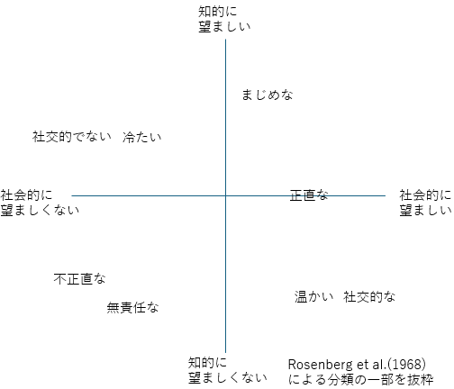 ある態度を説明する際に,複数の側面を必要とする場合があります.例えば,対人認知(人に対する印象,ある人が好ましいかどうか)に関する研究ではRosenberg et al.(1968)が,対人的な印象を形成する認知次元として社会的望ましさと知的望ましさの2次元を見出しています.