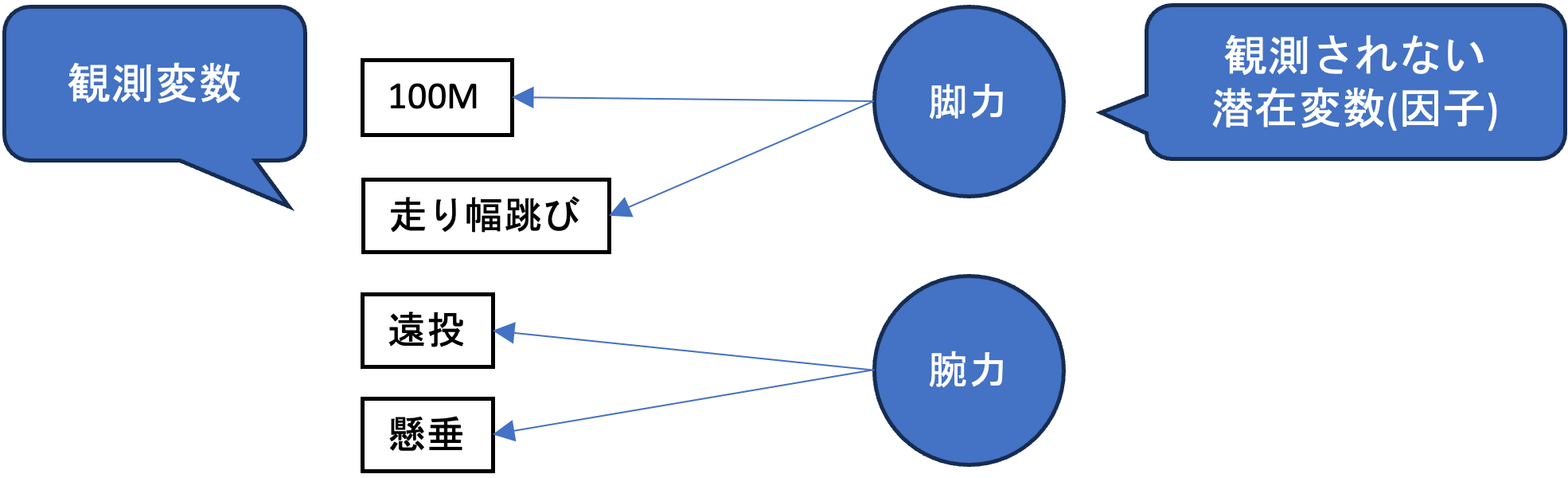 体育大学合格率(観測) = 脚力(潜在) + 腕力(潜在) + 筆記テスト成績(観測)