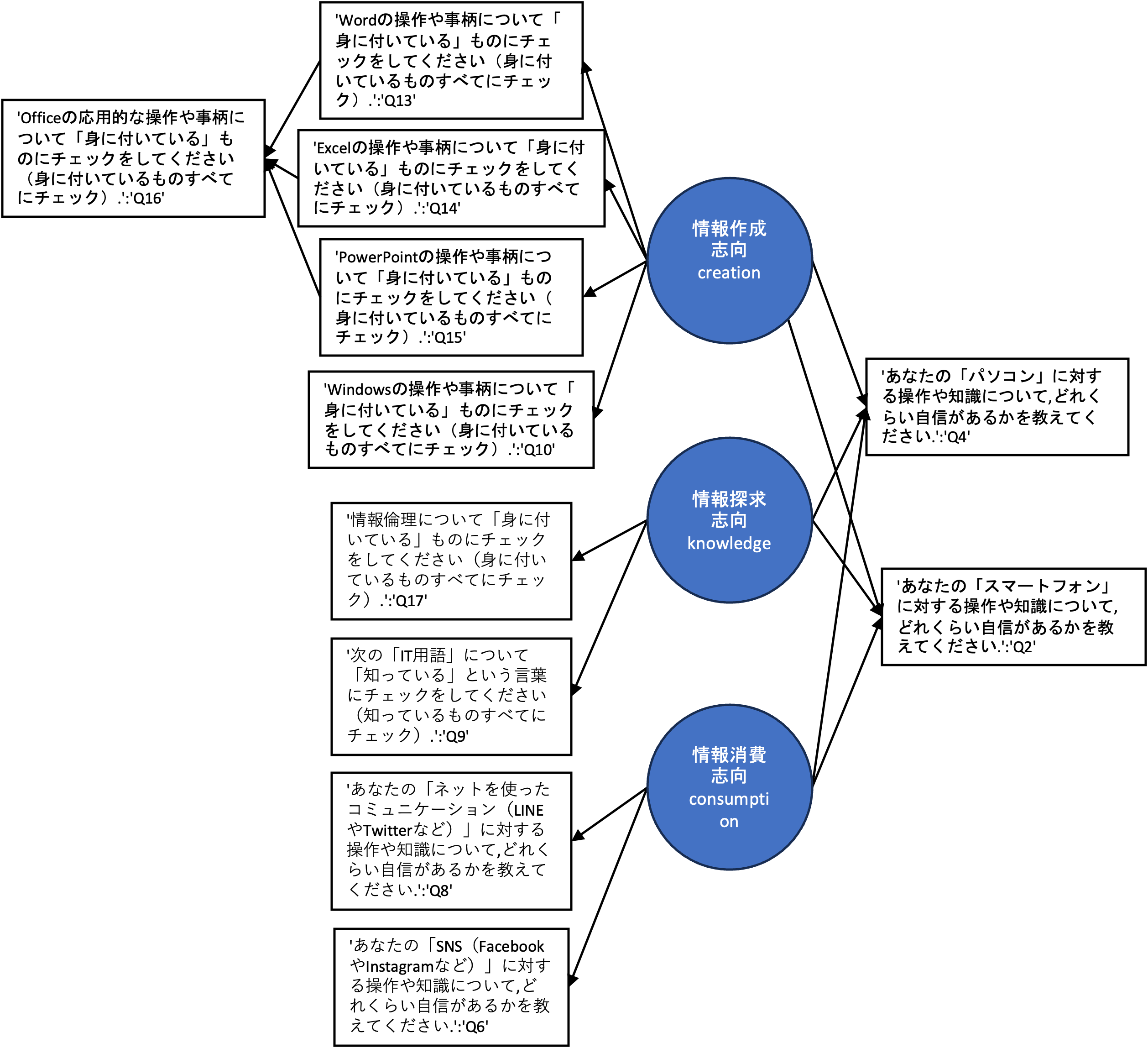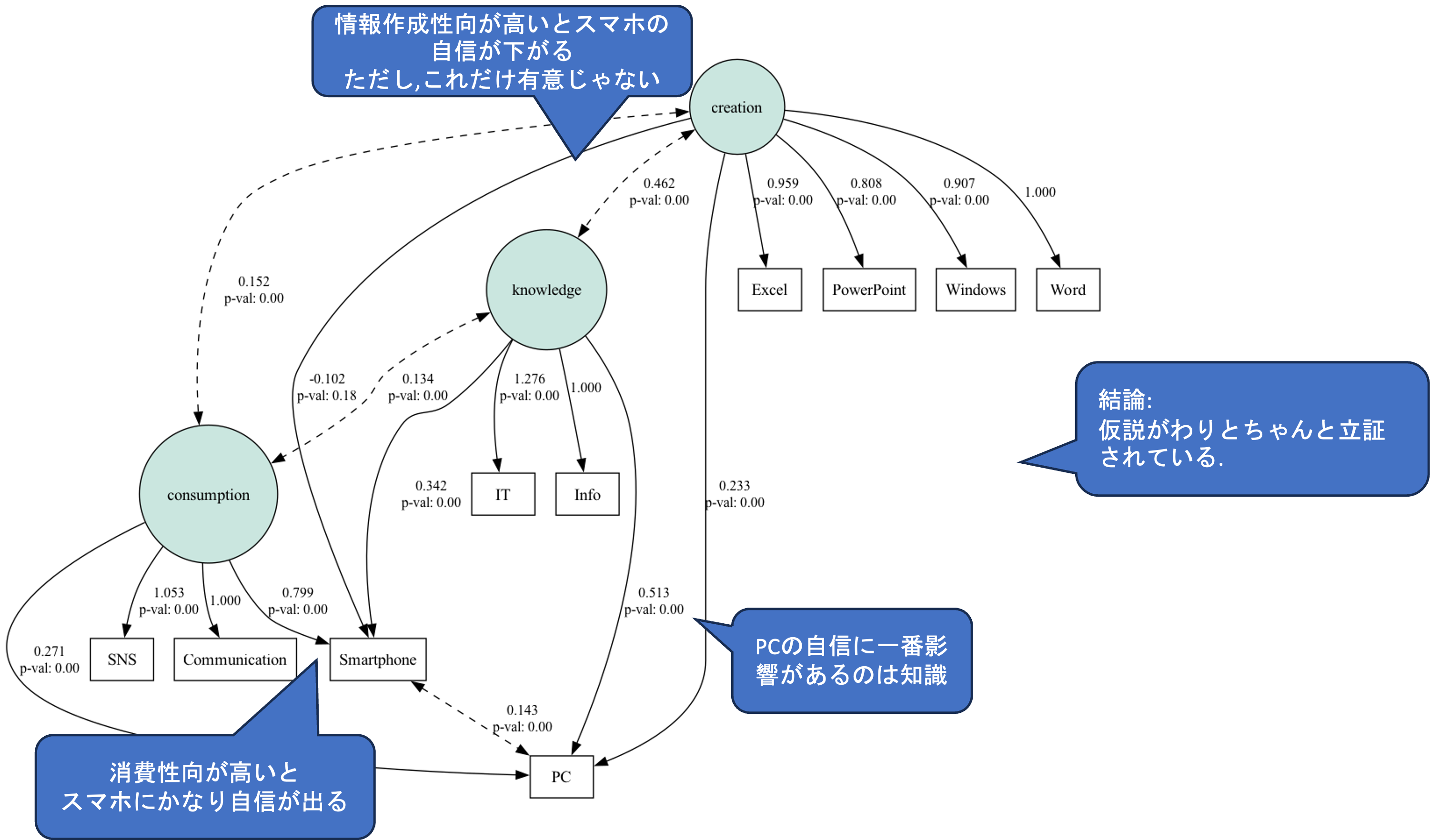 今回は, 潜在因子として, Word,Excel,PowerPointのスキルによって構成される情報作成志向,情報倫理,IT用語に関する知識によって構成される情報探求志向,SNSやネットのコミュニケーション能力によって構成される情報消費志向によって,パソコンとスマートフォンに対する自信が決まるという因果関係を表しています. また,情報作成志向を構成する観測変数は,Office操作技能によって影響を受けるという構造になっています.