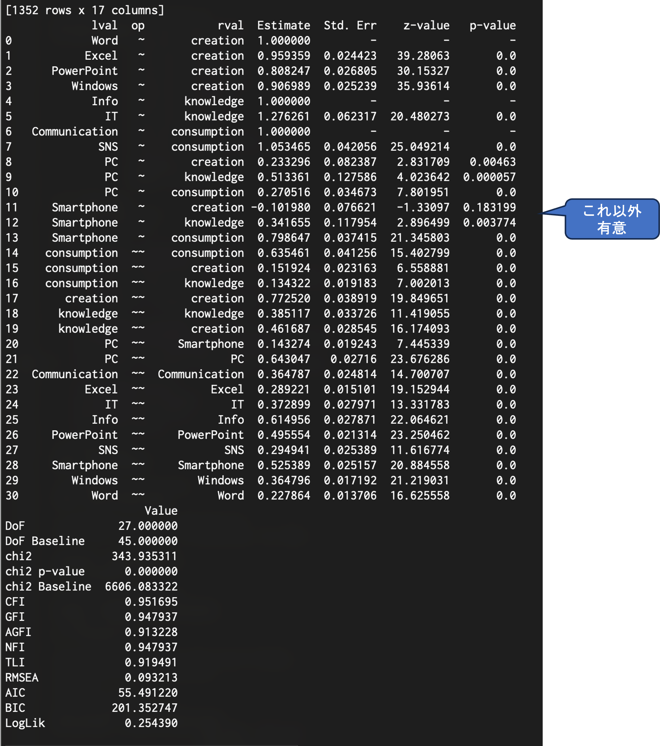 今回は,スマートフォンに関する興味関心から情報作成志向に対するパス以外は有意でした.また,モデル全体を評価する指標も概ね問題なく,データによってモデルの適合性が確認されました.