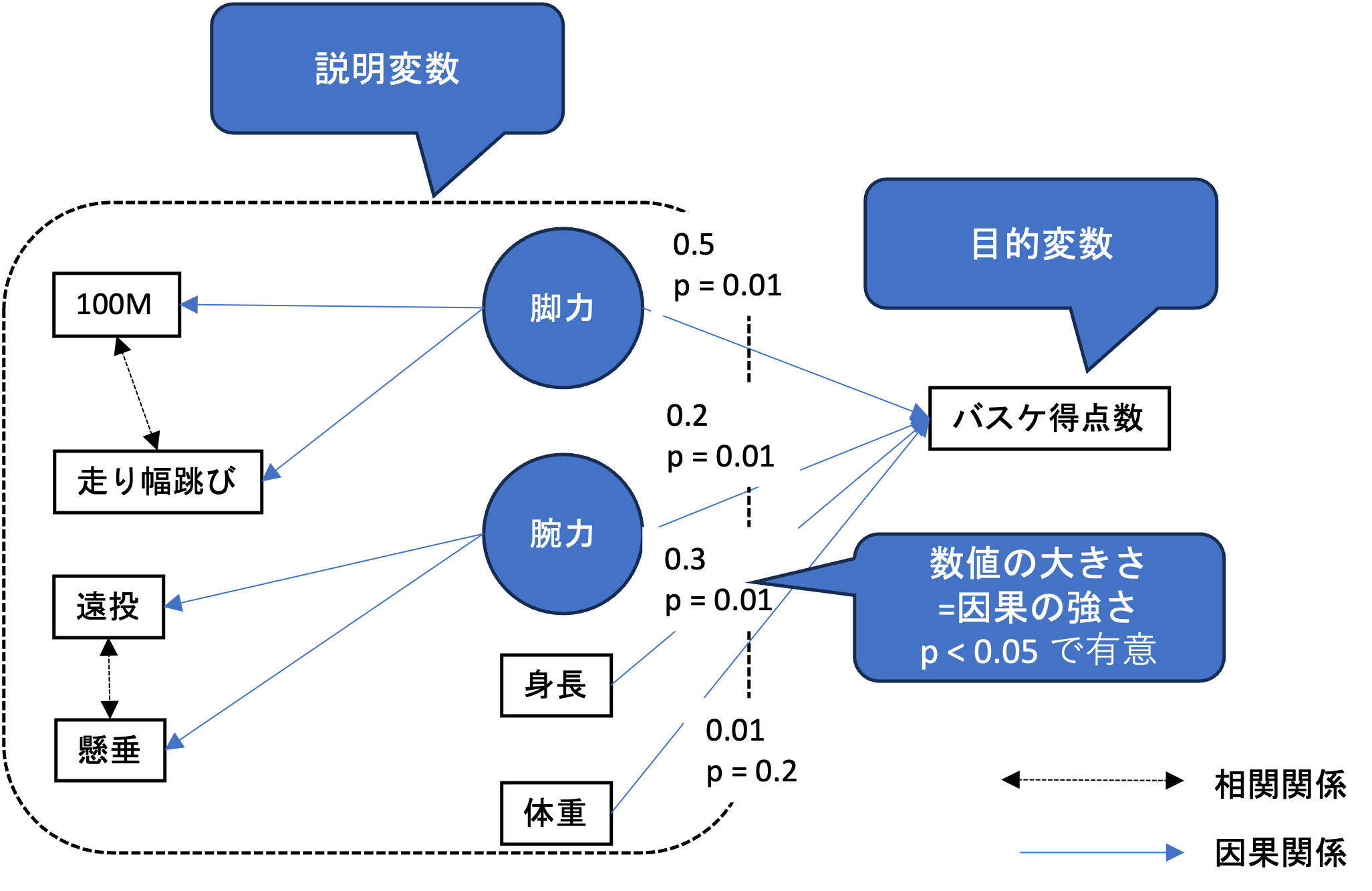 パス図では,モデル内の変数間の因果関係を矢印として表し, p値と偏回帰係数によってそれぞれの因果関係の検定と影響力が示されます.