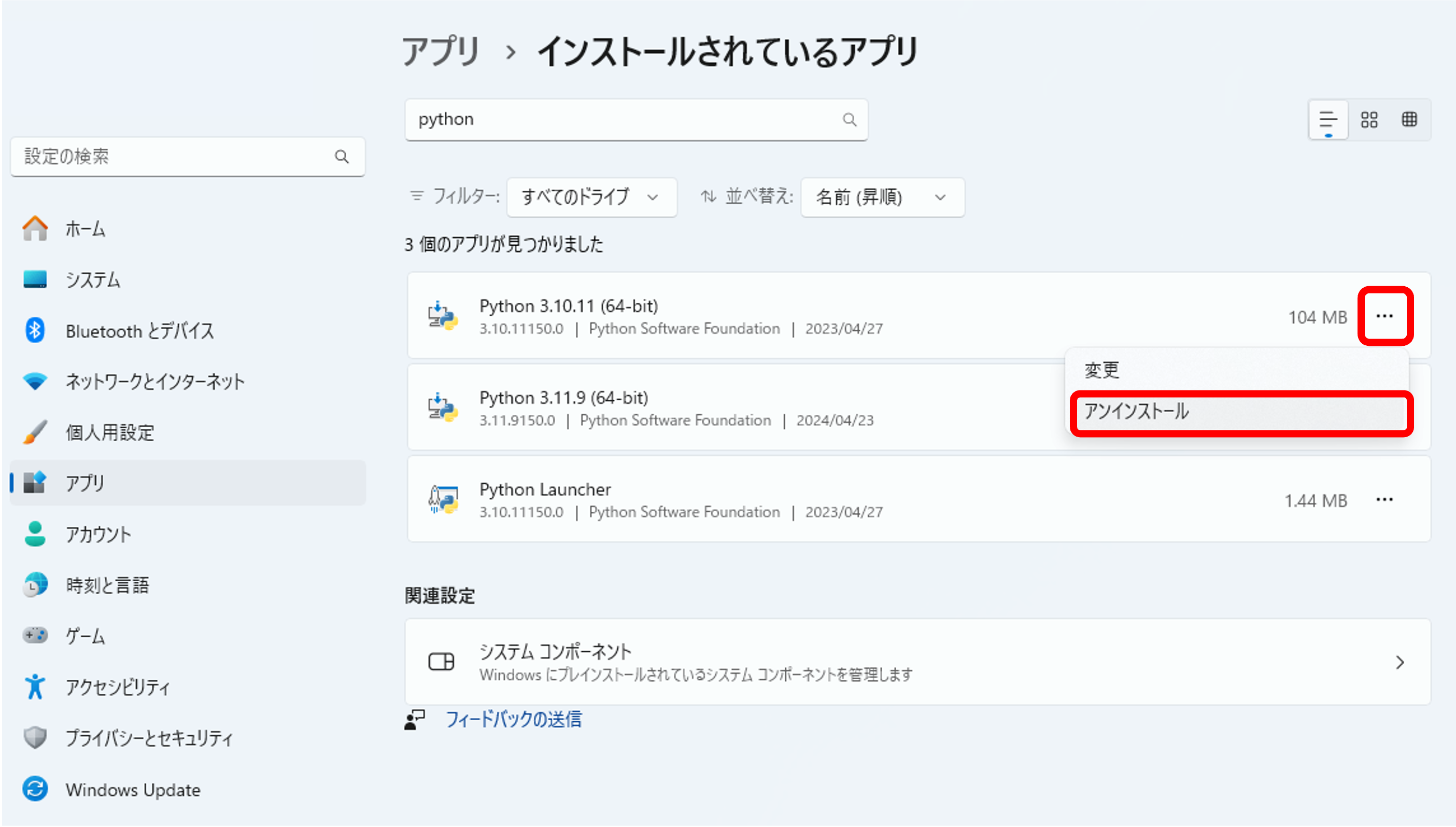 設定 > アプリ > インストールされているアプリから pythonを検索して, Python X.X の形式のアプリと,Python Luncherなどをアンインストールしてください.