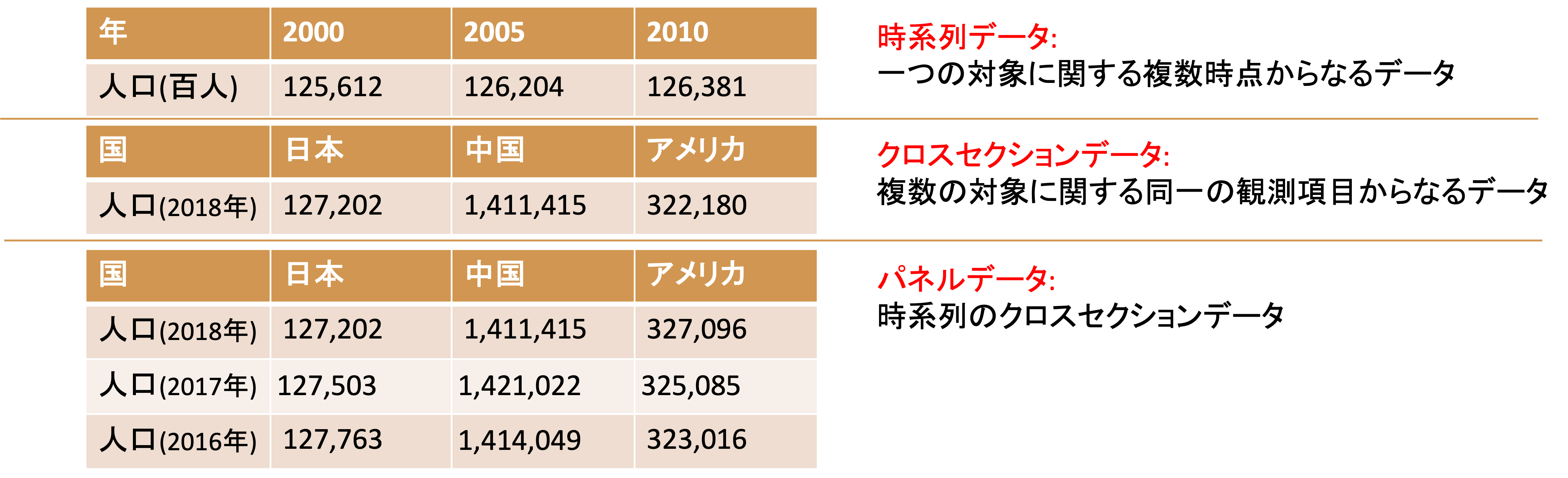 また,観測項目や観測対象の組み合わせによって,特別に呼称され,それぞれ独自の分析手法が存在するデータもあります(時系列データと時系列解析,パネルデータと,パネルデータ分析など)