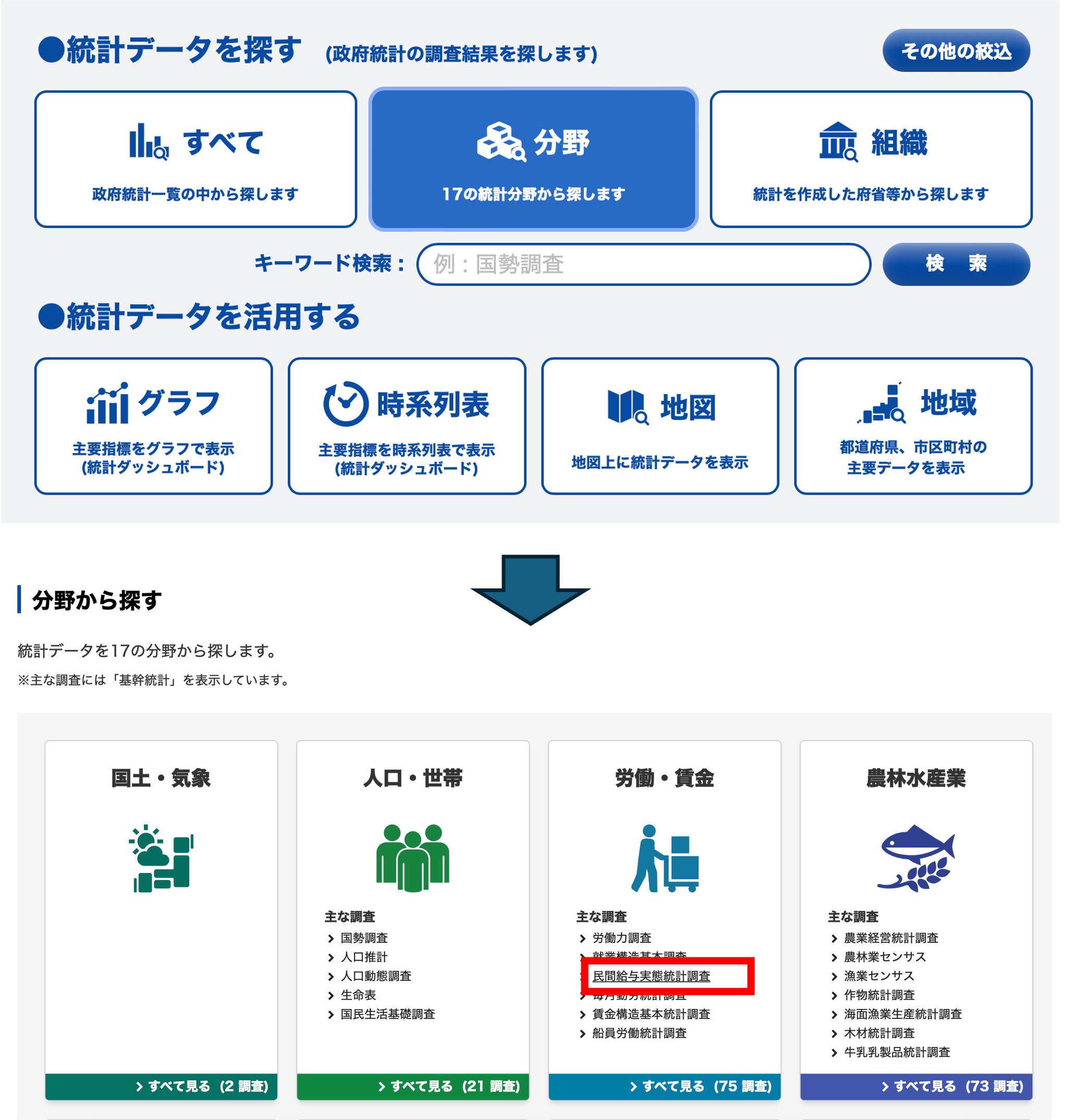まずは使いたいデータを探します. 方法はいくつもありますが,ここでは分野から探してみましょう. 分野→労働・賃金→民間給与実態調査の順にクリックしてください.