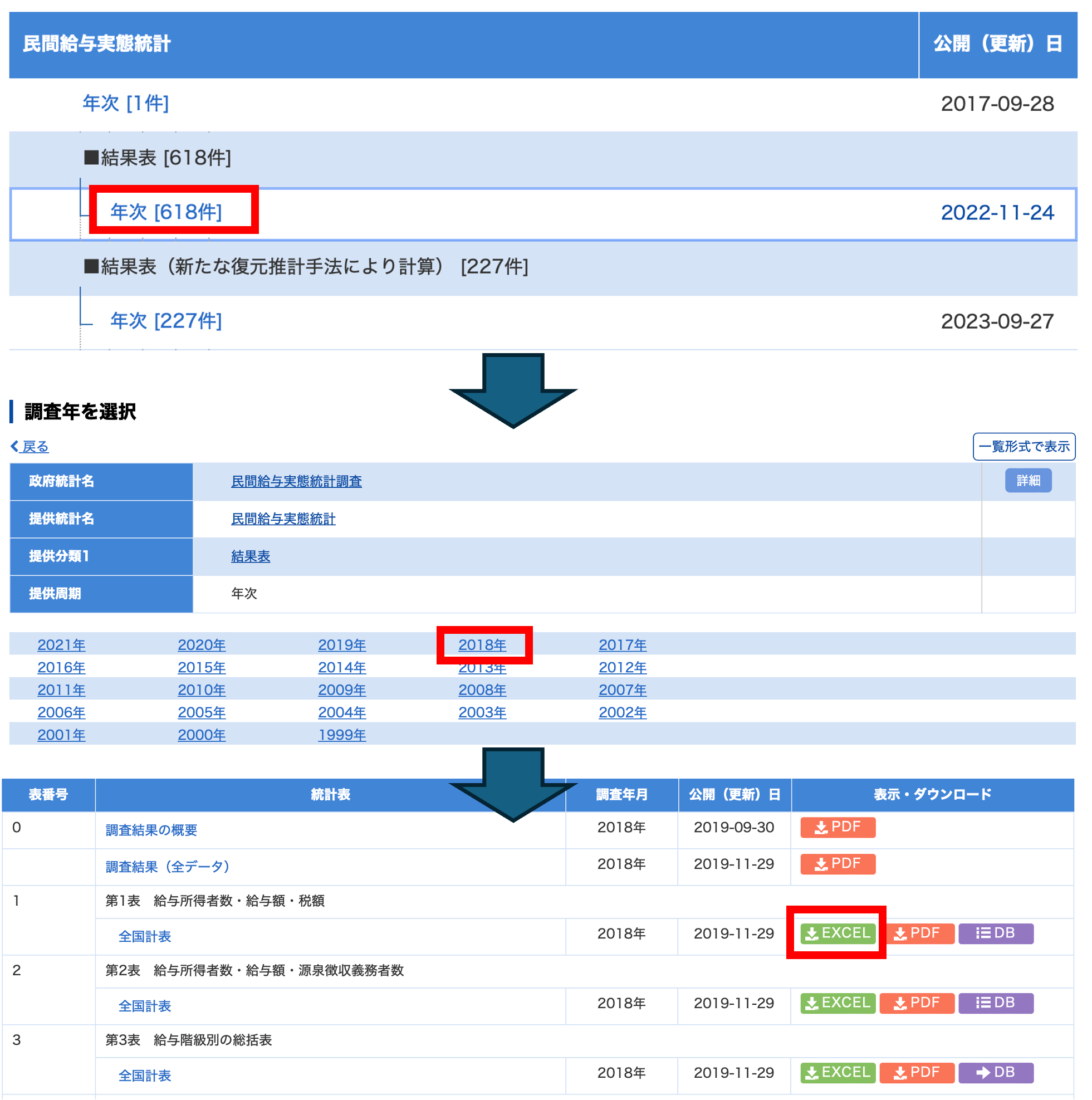官庁の作成する統計は,民間給与実態調査などの調査名,統計名の下位分類として,年次推計,延長推計などの提供分類,その下に対象年次,更にその下に表レベルの分類があります. これはそれぞれの統計にある程度詳しくないと意味がわからないかと思いますが,今は練習ですので気にせず,結果表の年次推計の2018年度の第1表 のExcelをクリックしましょう.