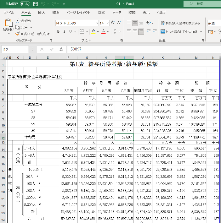 これで,民間給与実態統計調査結果表年次推計2018年度第1表 給与所得者数・給与額・税額 全国計表 がダウンロードできましたので,開いてみましょう.