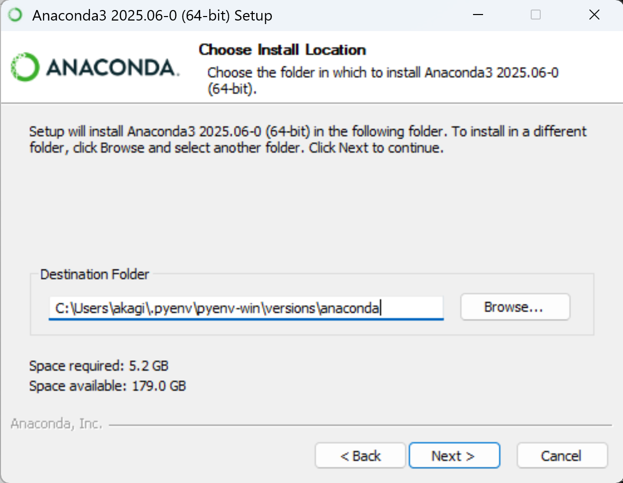 インストール先の設定画面が出たら, pyenvのversionsフォルダに保存します.
